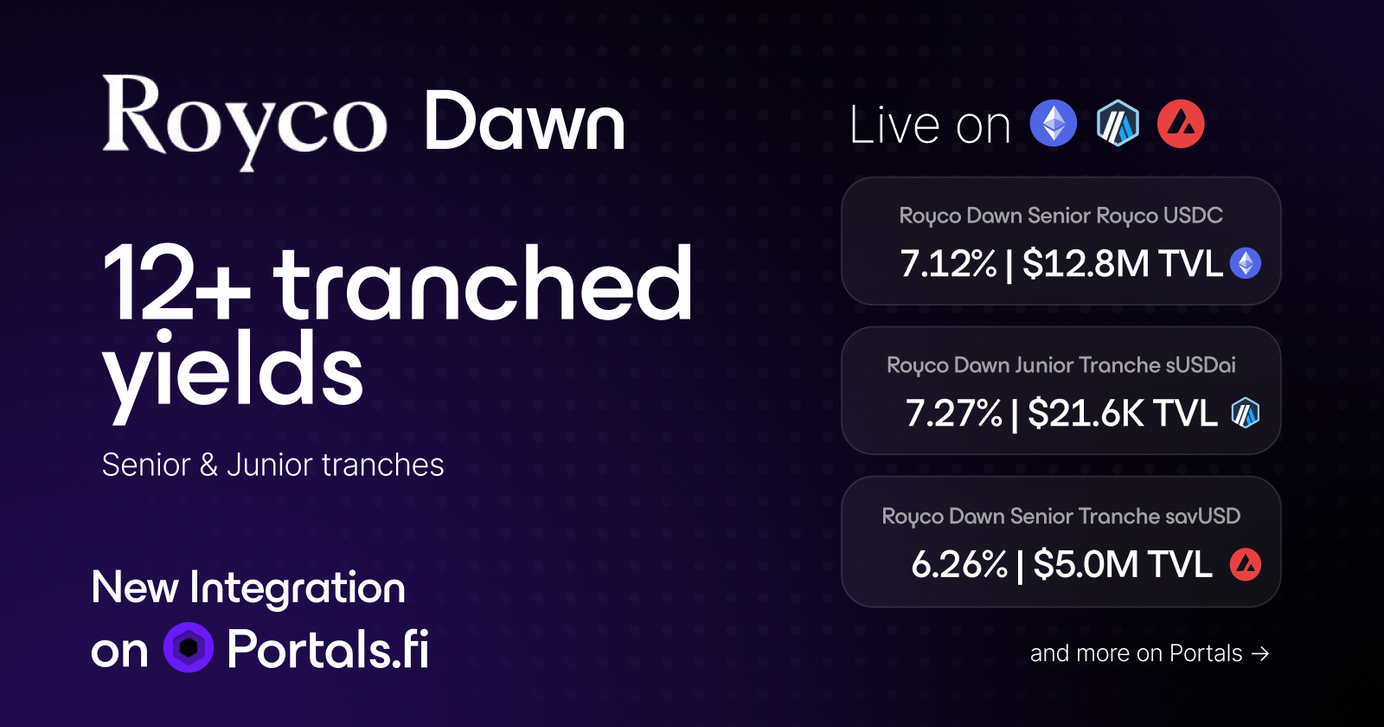 Royco Dawn is now supported on Portals. Positions from the Royco Dawn ecosystem on both Avalanche and Arbitrum are live on the Portals Explorer, where users can browse them alongside opportunities from across DeFi. This article reflects the status of the integration described as of the publication date. Supported positions