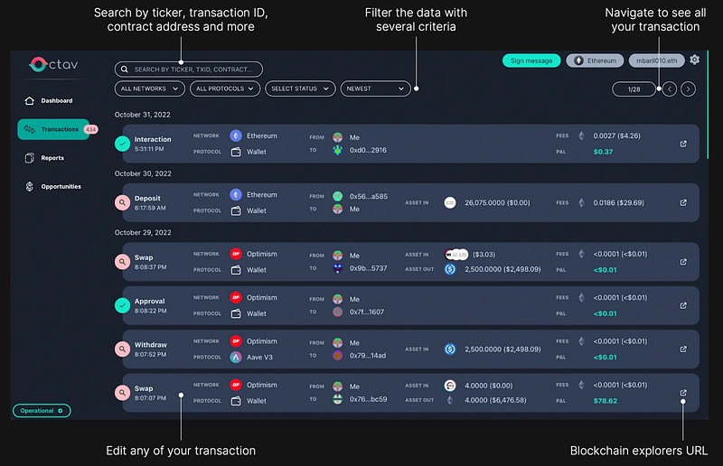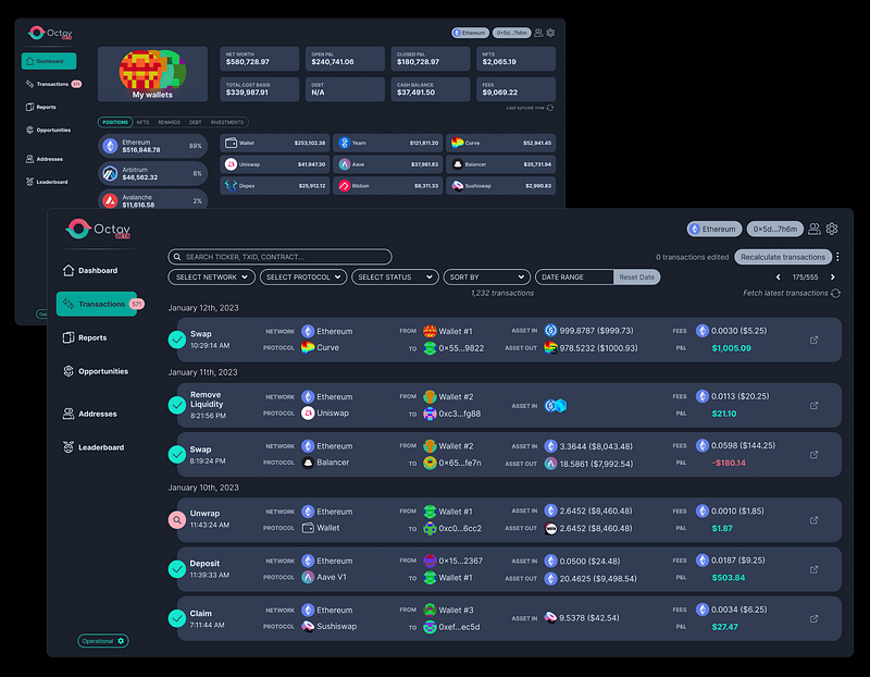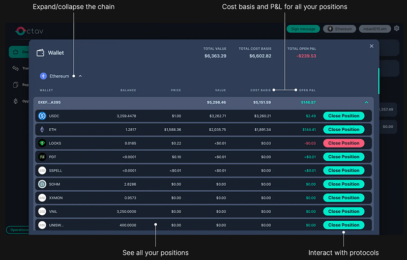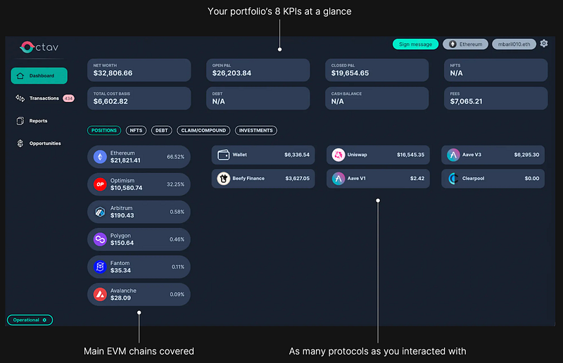 Regardless of which Web3 wallet you plug into Octav, prepare to be enlightened. Whether youâre interested in your net worth, want to dive into your Profits & Loss across all positions, or want to assess the cumulative fees of your wallet transactions; Octav renders your portfolio an open book.