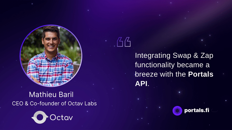 When youâve found a winning strategy, or assessed a gap in your portfolio that needs filling, you donât want to leave the platform just to fulfill those DeFi needs. Thatâs why Octav teamed up with Portals, utilizing the Portals API to enable Swap & Zap functionality.