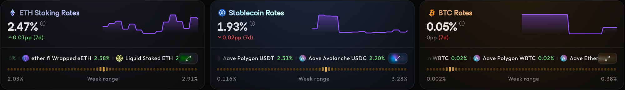 - At-a-Glance Market Overview: Instantly gauge the market with high-level rates for ETH Staking, Stablecoins, and BTC, displayed prominently at the top of the page.