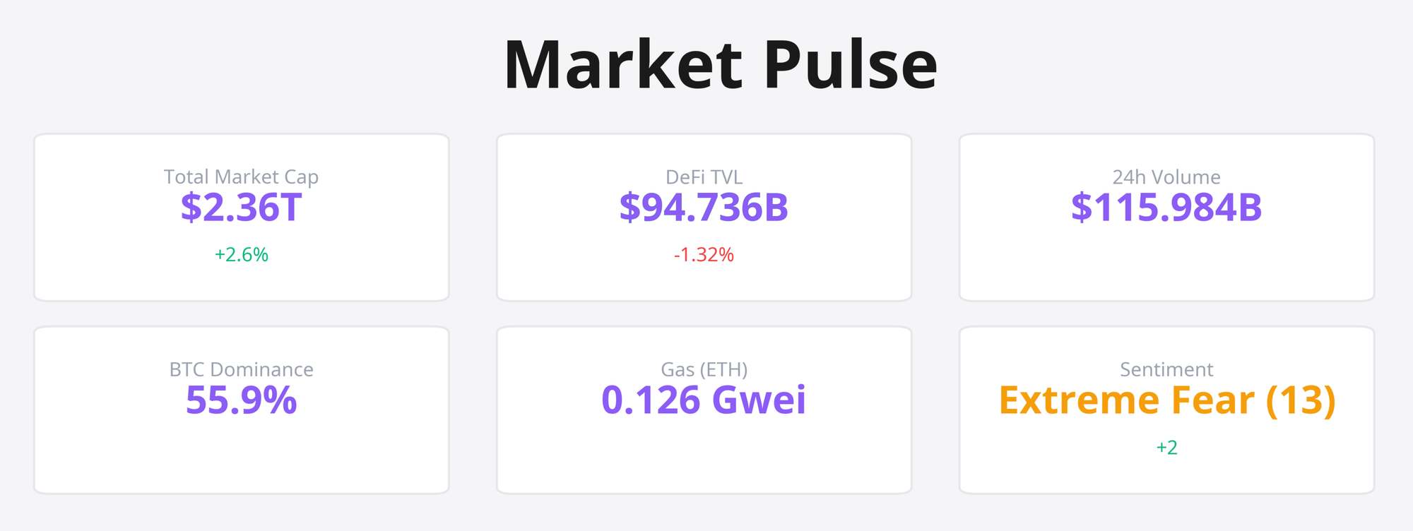 - Total Market Cap: $2.36T (+2.6%)