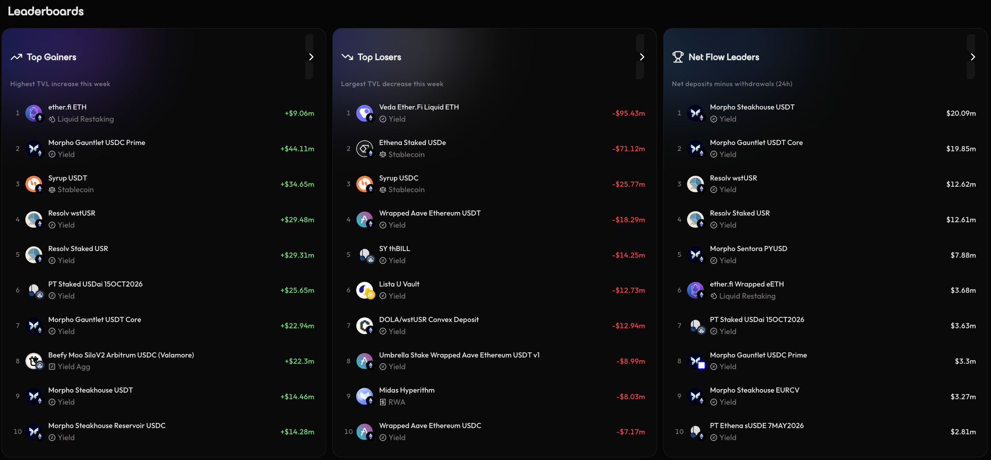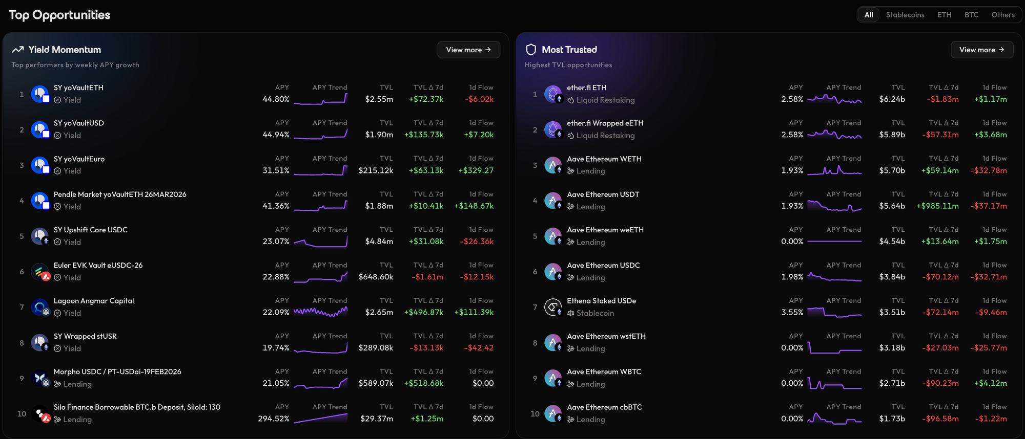 - Yield Momentum: Identifies the top performers based on weekly APY growth.