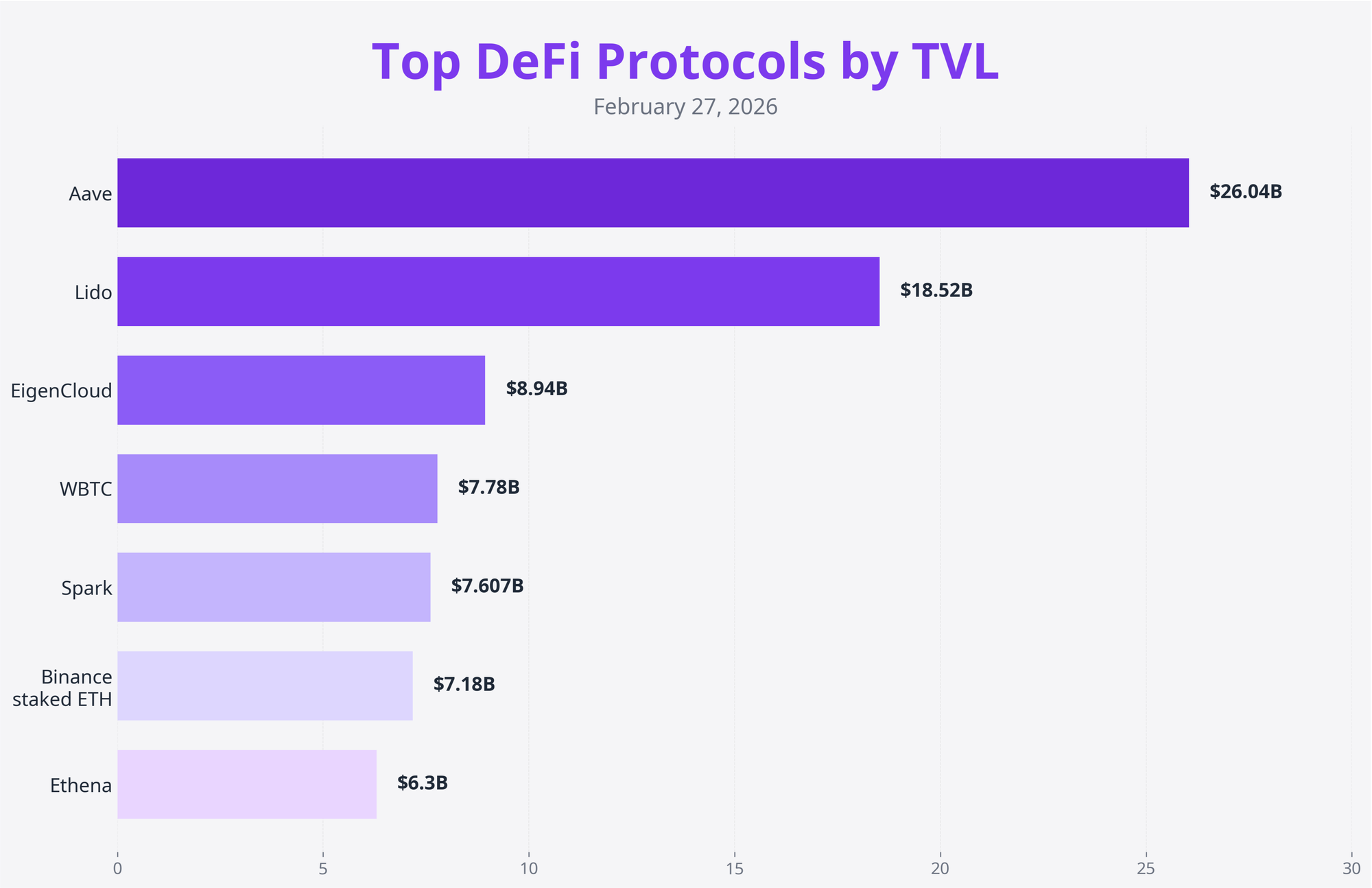 The DeFi protocol landscape remains dominated by established players, with Aave, Lido, and EigenCloud holding the top spots. The top 7 protocols by TVL show a mix of lending, liquid staking, and restaking services, highlighting the key pillars of the current DeFi ecosystem.