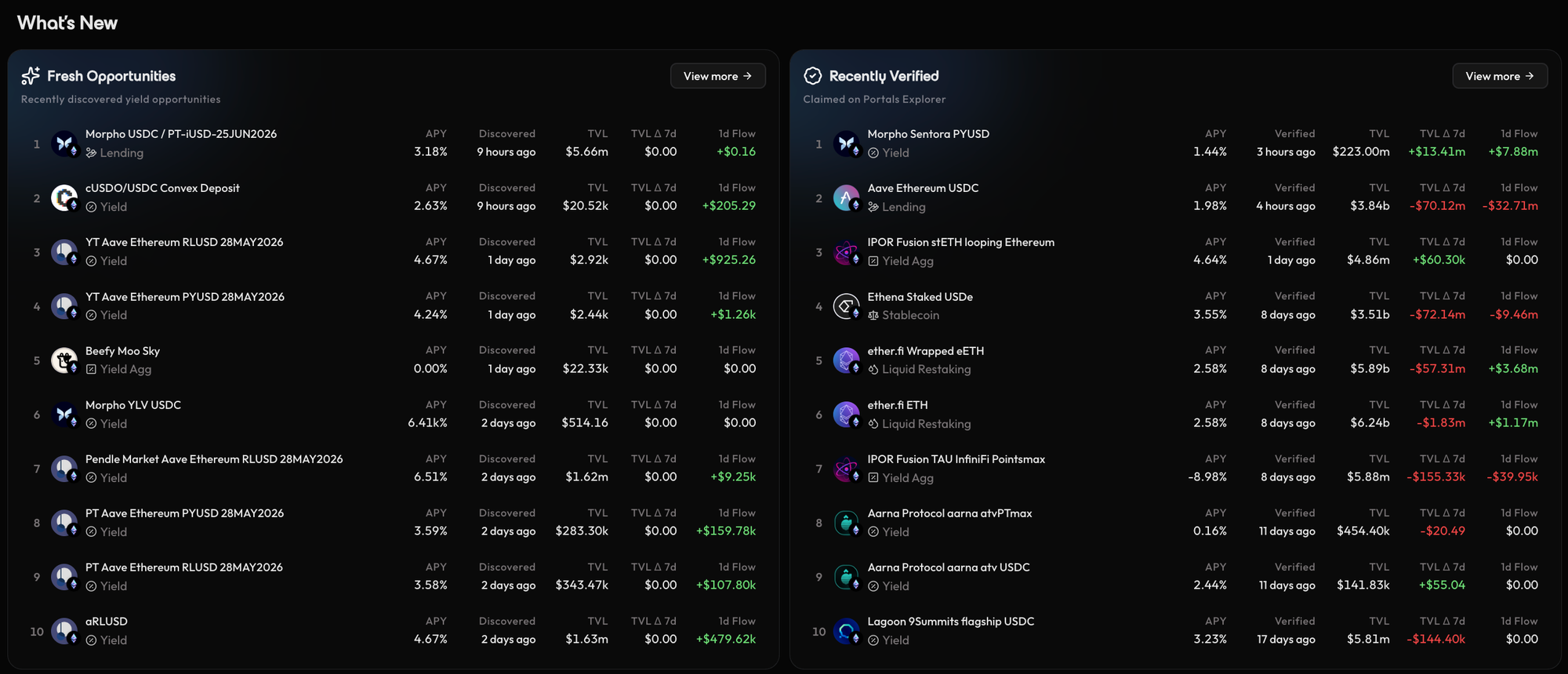 - Fresh Opportunities: A list of recently discovered yield opportunities.