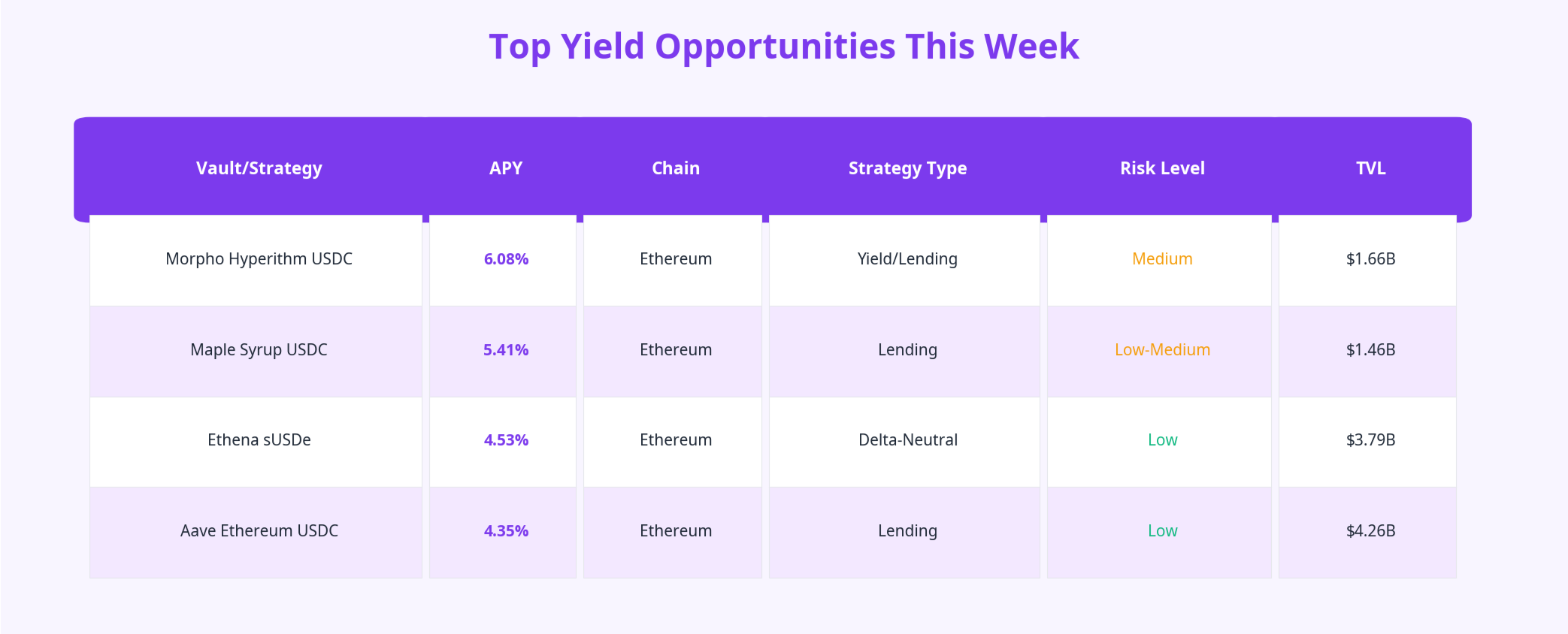 Aave Ethereum USDC: The gold standard for decentralized lending now offers 4.35% APY (up 0.63pp from last week) with $4.26B in TVL. The yield increase reflects higher borrowing demand during the market correction.